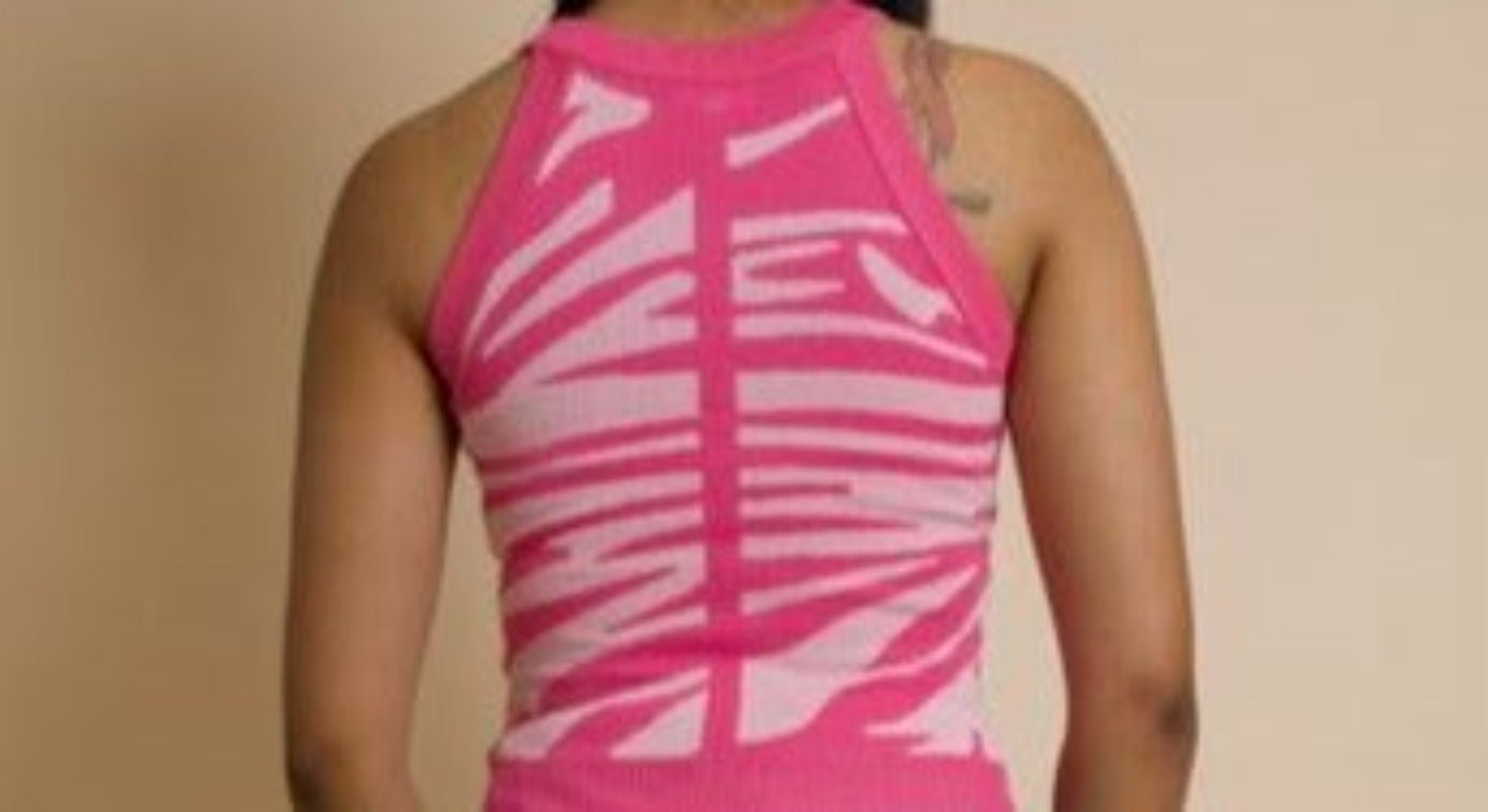 This pink knit top is definitely giving summer vibes! Designed with a zebra print adding a very chic glam. Perfectly paired with a maxi skirt and a clear pump.