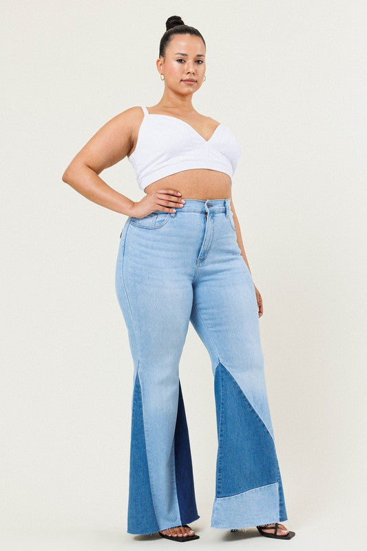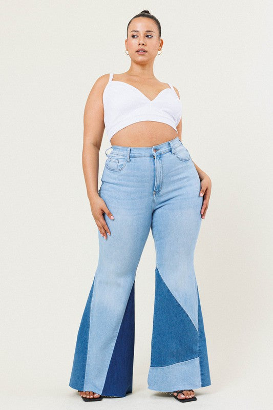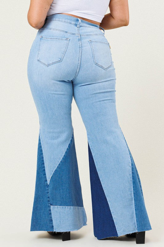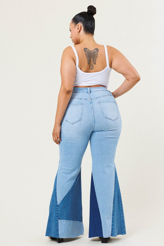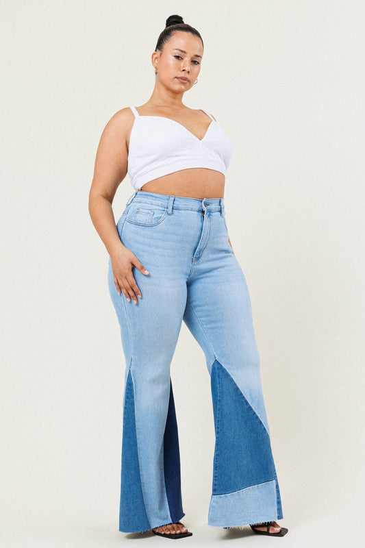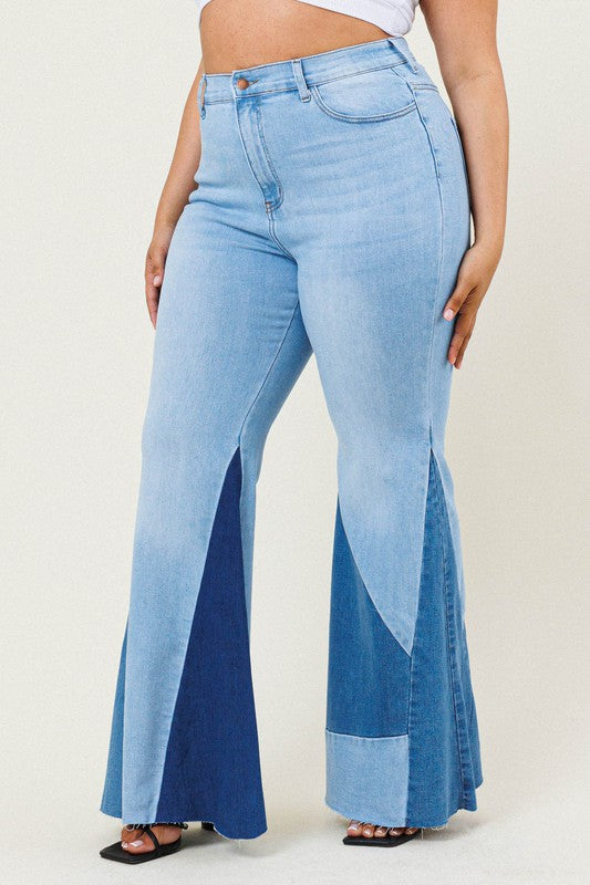 Introducing our statement-making High Rise Color Block Flare Denim Jeans. These plus size jeans feature a stretchy fit and form fitting silhouette for a flattering look. Adorned with side slits and two front and back pockets, dress them up or down for any occasion. Elevate your style with our color block denim.