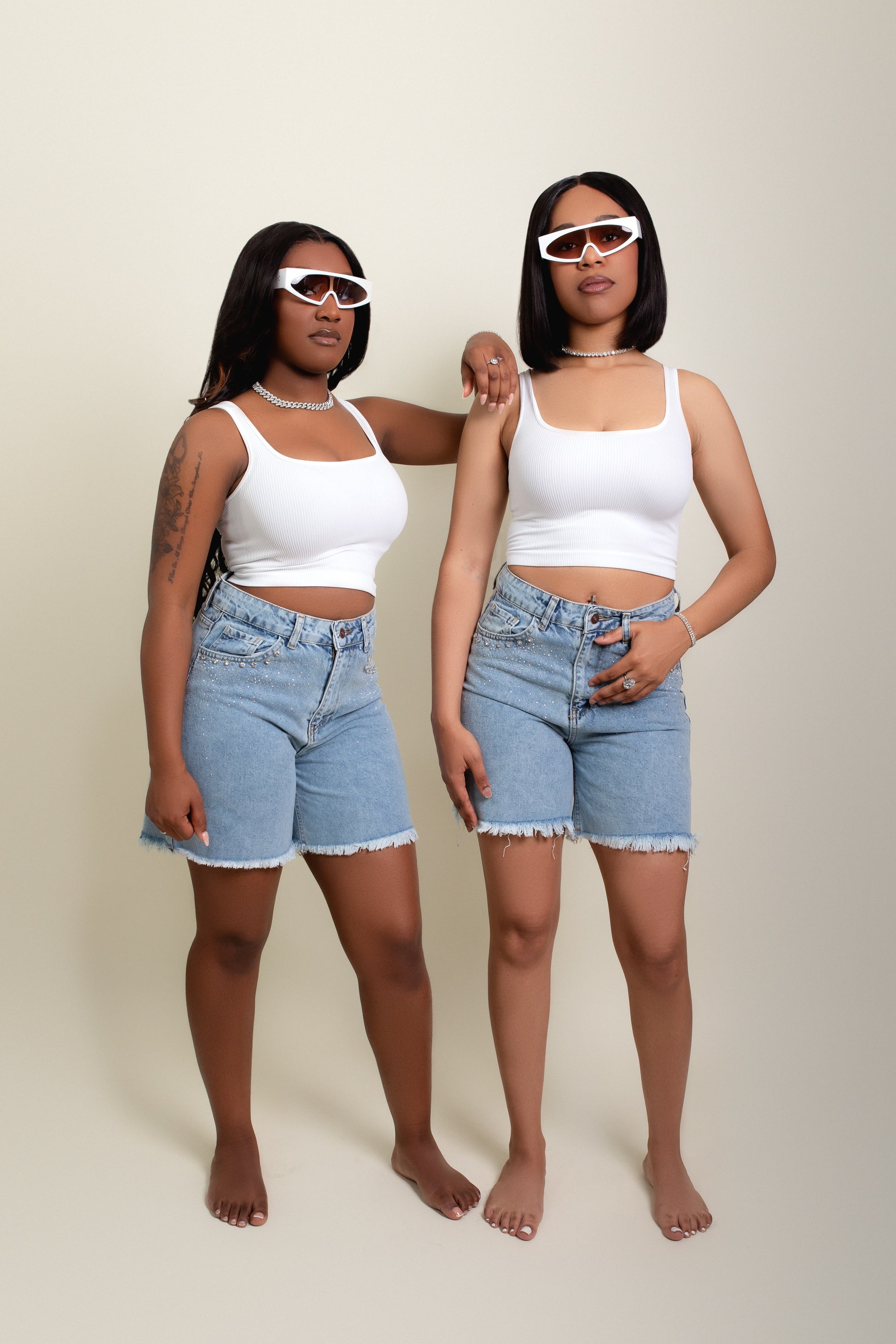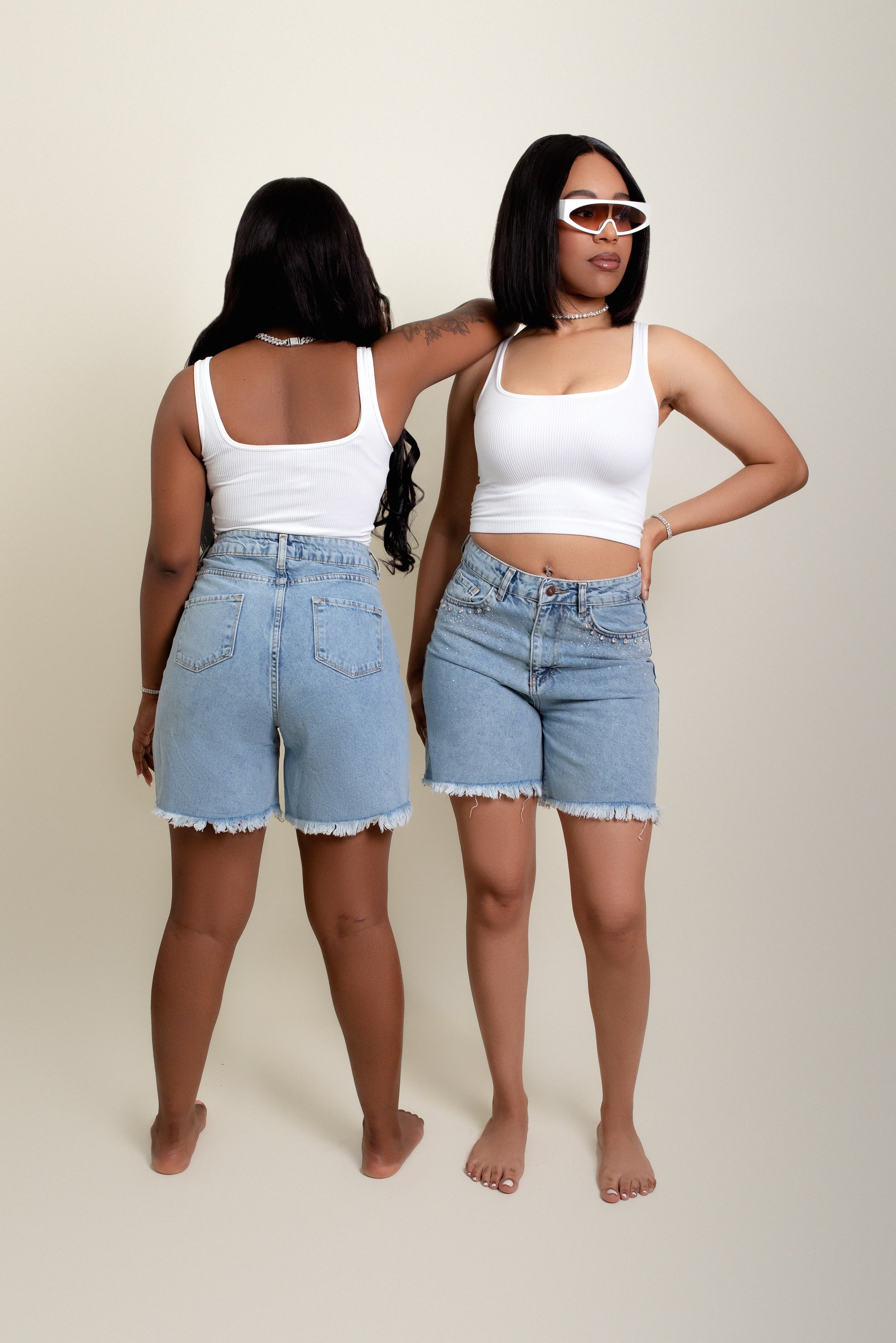Elevate your summer wardrobe with our rhinestone embellished denim biker shorts. Featuring a high waist fit and a distressed hem, these shorts are both stylish and comfortable. Made with 100% cotton, they can easily be dressed up or down for any occasion. Perfect for a leisurely summer day or everyday wear.