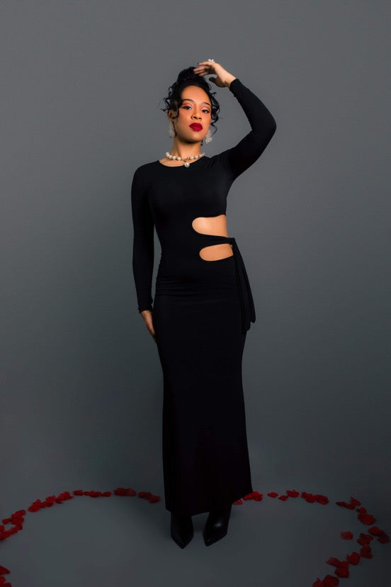 Indulge in the ultimate evening with our Black Long Sleeve Cut Out Maxi Dress. Its soft quality material accentuates your curves while the minimalist, yet classy and sexy design is perfect for a date night or Valentine's Day occasion. Elevate your style with this luxurious and exclusive piece.