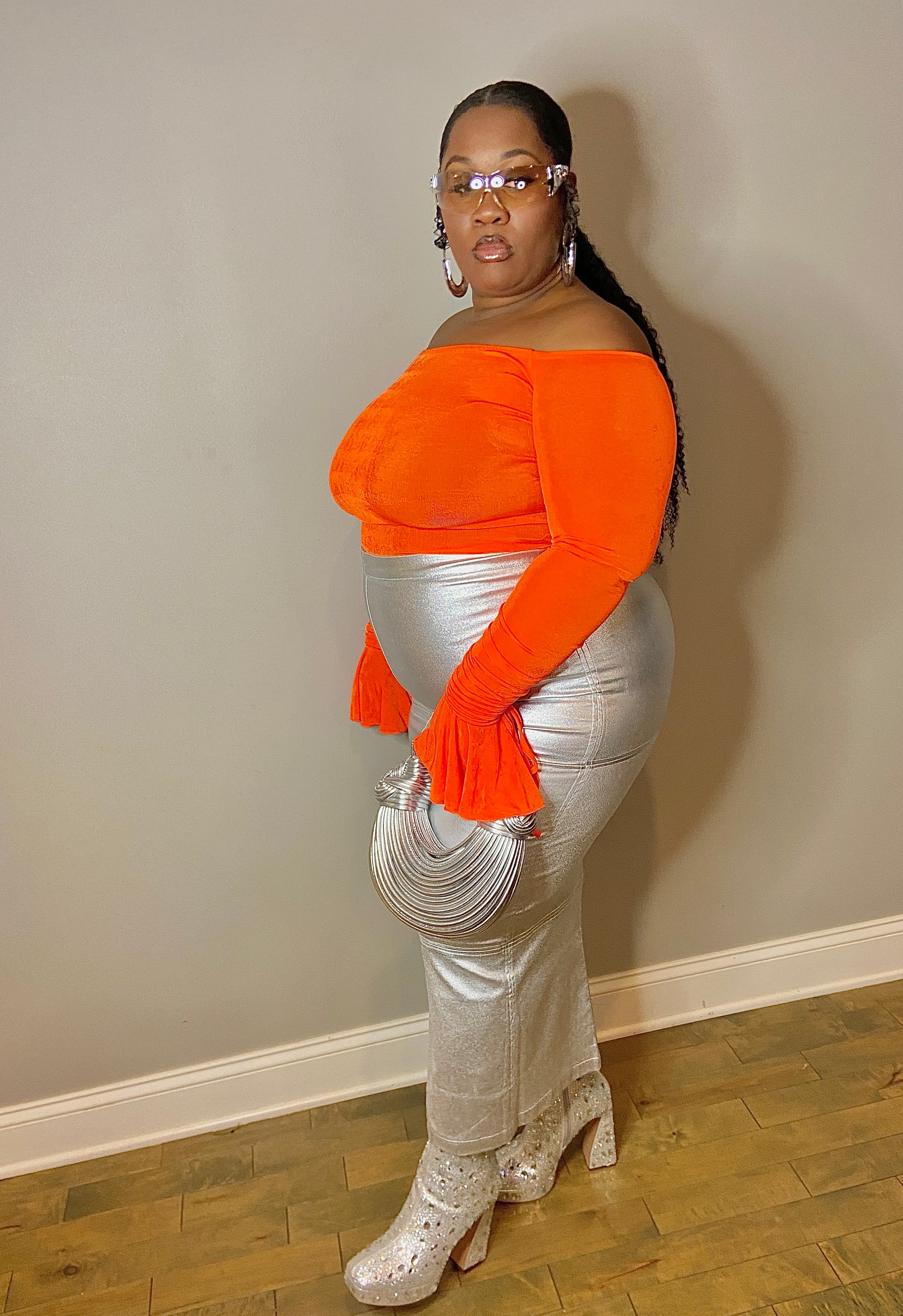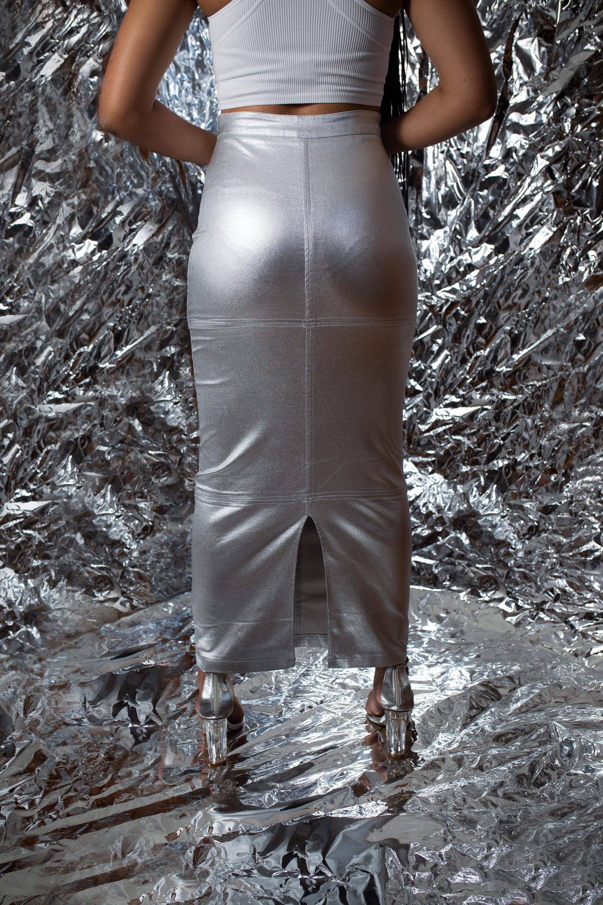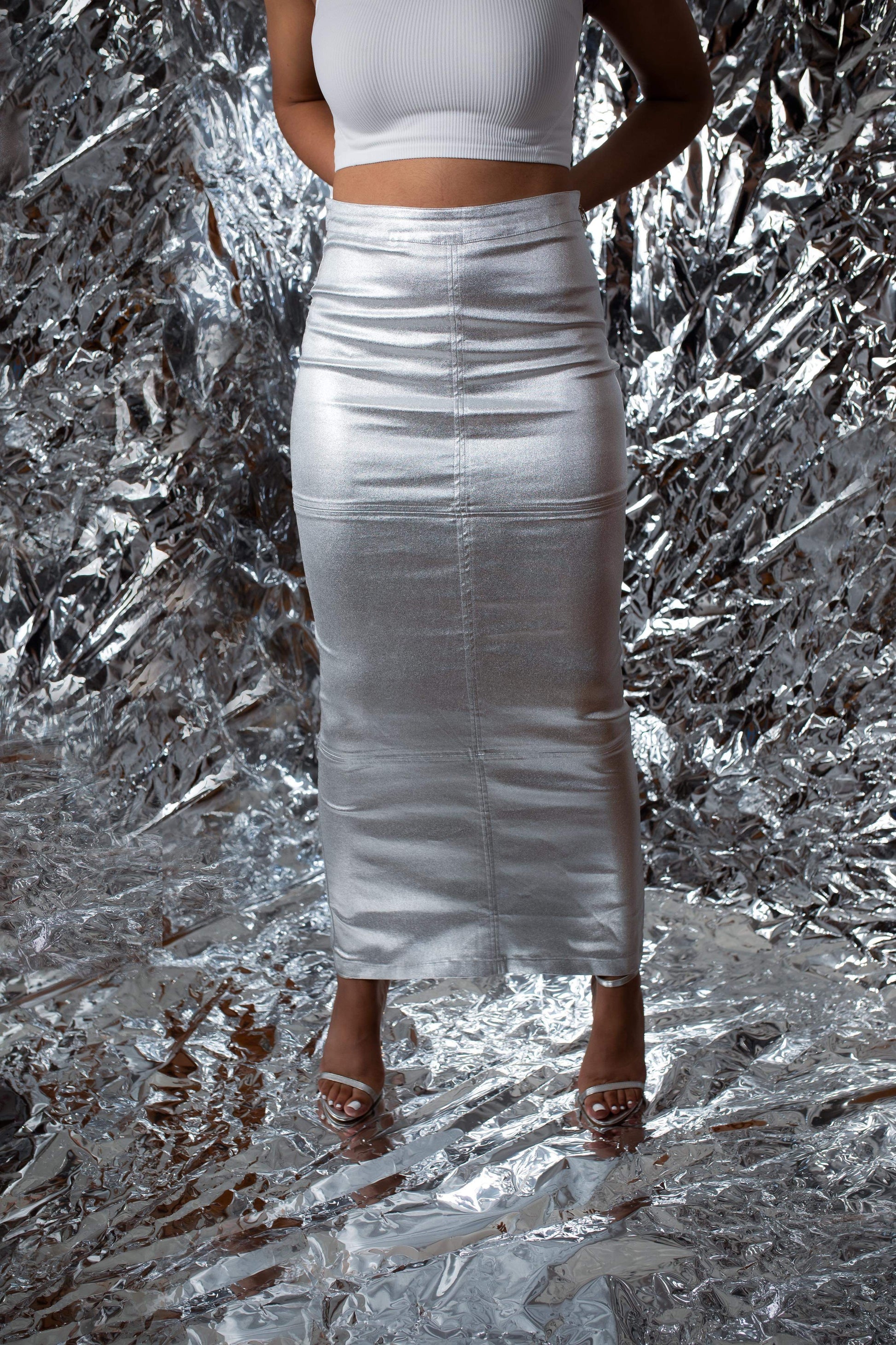This Metallic Maxi Skirt is a gorgeous statement piece, designed to gracefully flatter your shape with its classy, yet sexy stretchy quality material. Its shimmering metallic shine, and form-fitting style will have you feeling as elegant as ever for any special occasion. Slip into a perfect combination of timeless beauty and glamour. This silver maxi skirt fits like a glove and looks good on all body types. Also comes in Curve Sizes.
