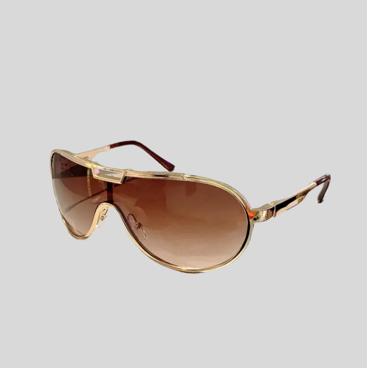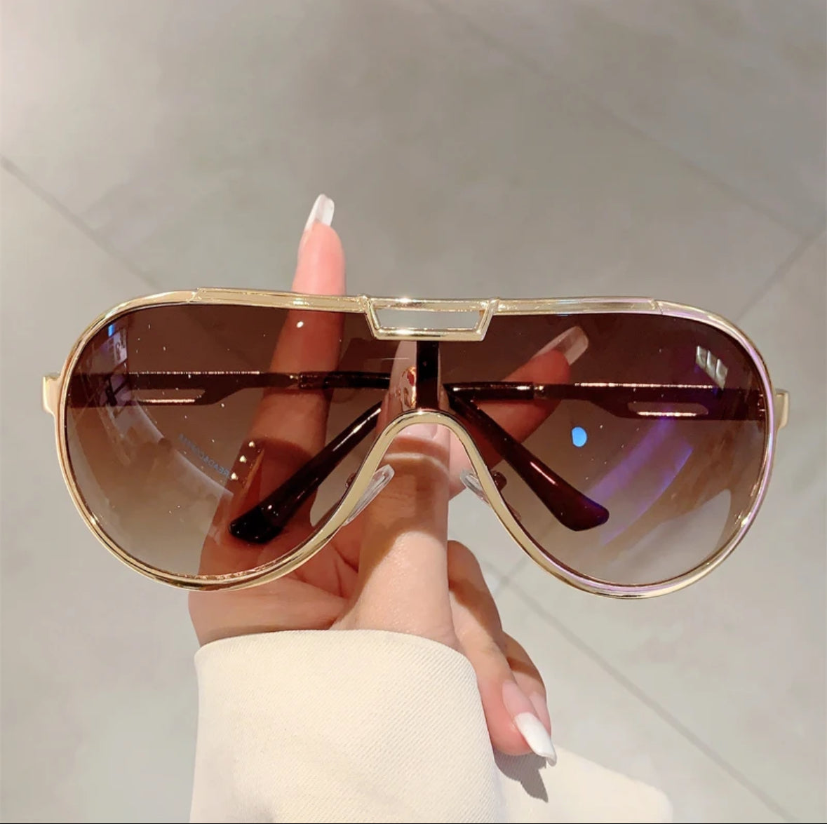 Introducing our Monoblock Aviator Sunglasses - the must-have accessory of the season. Featuring a vintage gold design, this oversized silhouette exudes edgy style with its double bridge feature. Elevate any outfit with this statement piece, adding a touch of sophisticated luxury to your wardrobe.