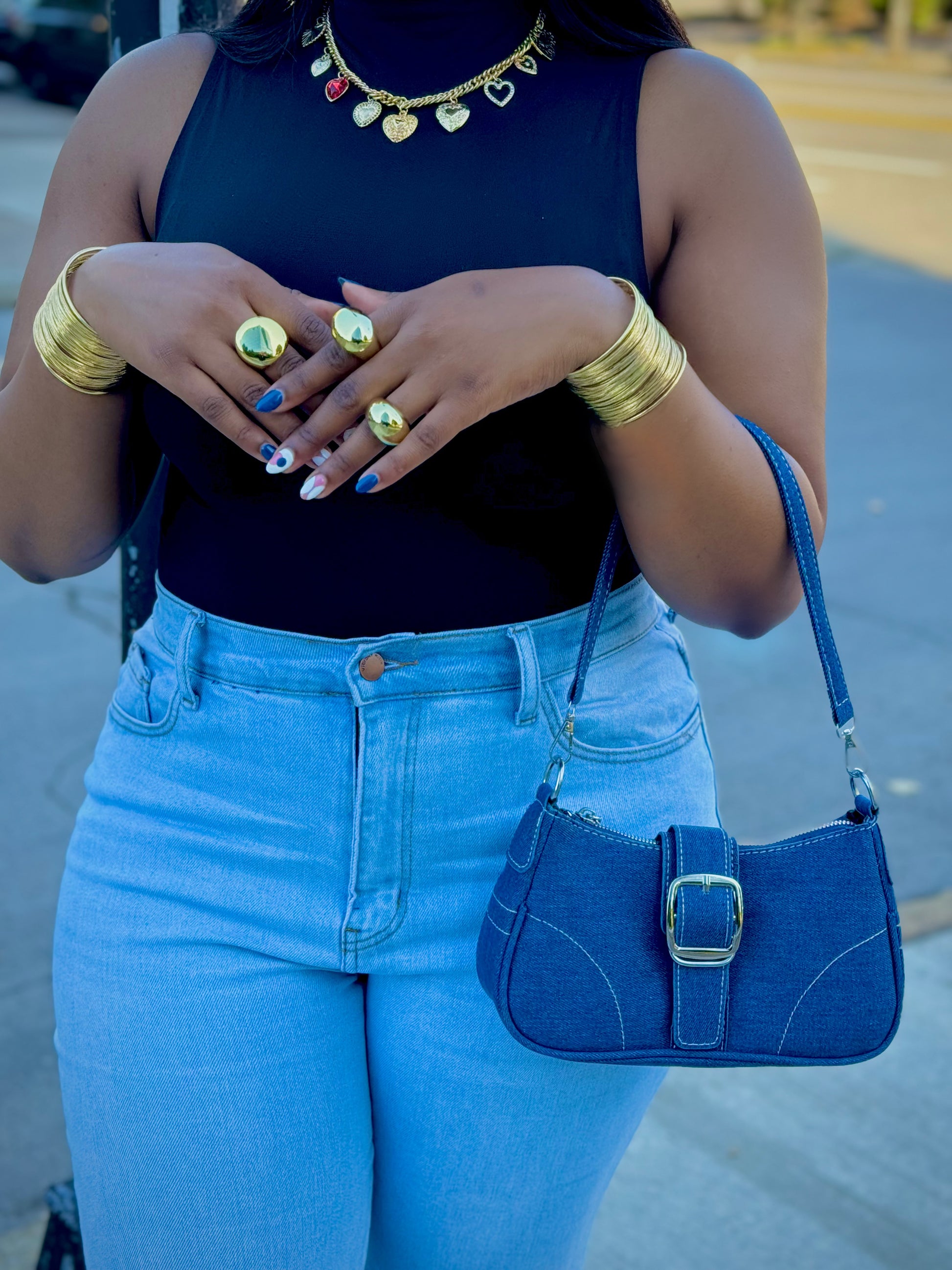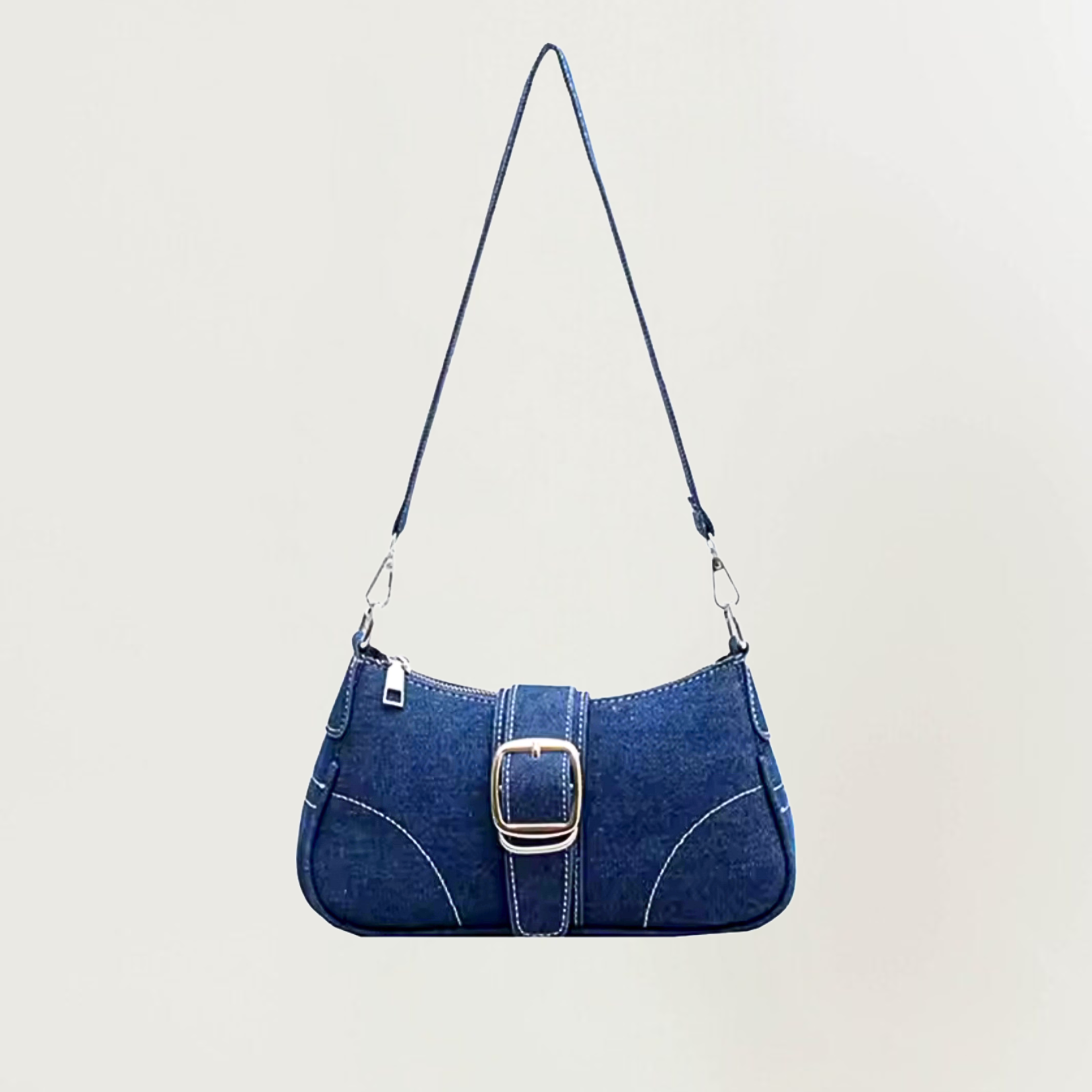 Elevate your style with our Stitch Denim Mini Bag. The intricate stitch detail and front silver buckle exude sophistication. Zipper closure and adjustable denim or silver chain strap offer versatility. Perfect for both occasions and daily wear. Make a statement with this classy essential.