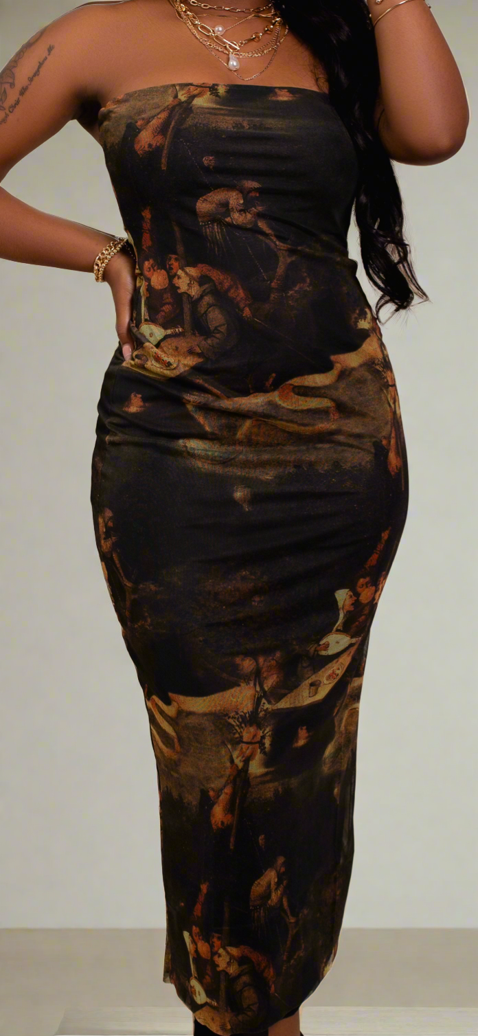 Indulge in unmatched elegance with our Strapless Vintage Painting Maxi Dress. Crafted with a lightweight, stretchy fabric, this dress accentuates your body with its waist-clinching bodycon fit. Its blend of black, olive, and tan colors adds a warm, earthy touch, making you a walking piece of vintage art. Transform it into a skirt for versatile styling options. Make a statement and turn heads with this unforgettable dress.