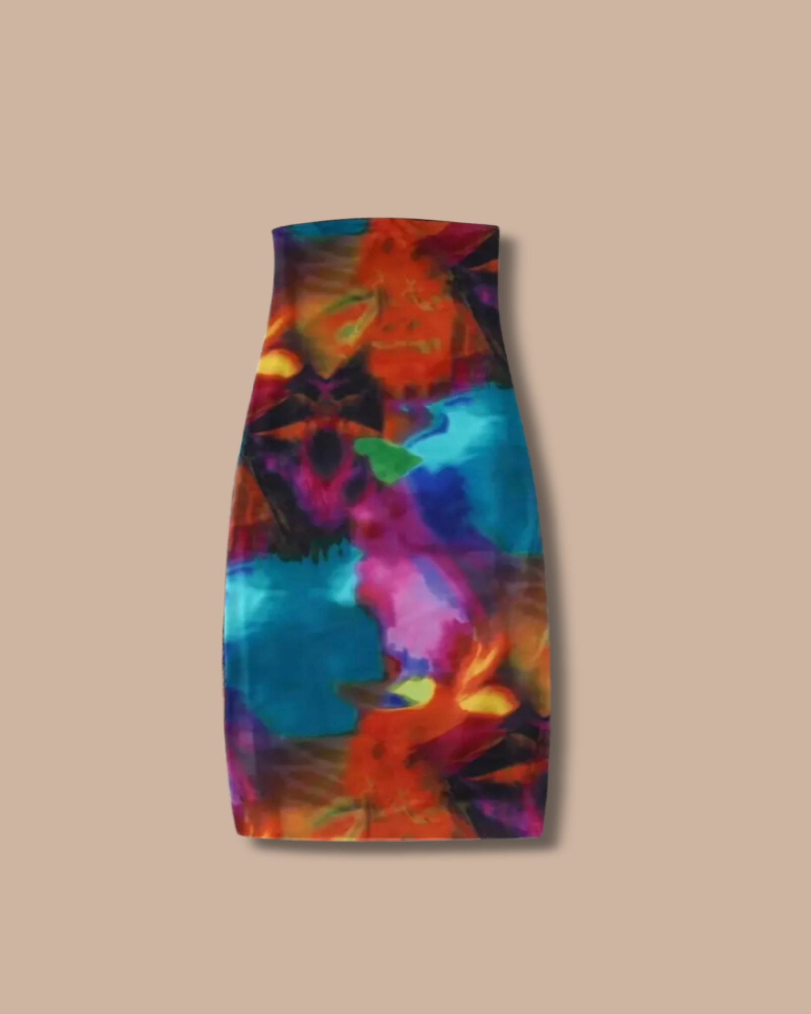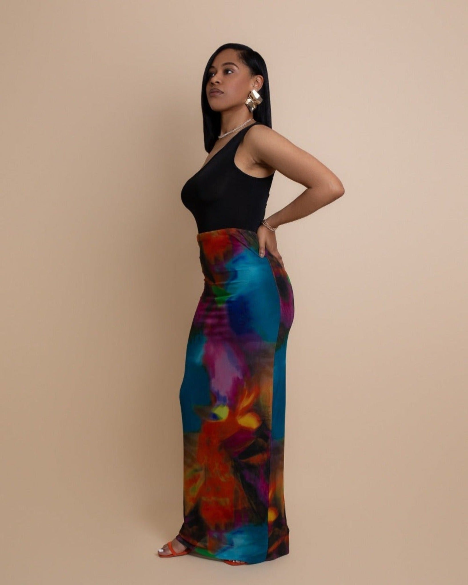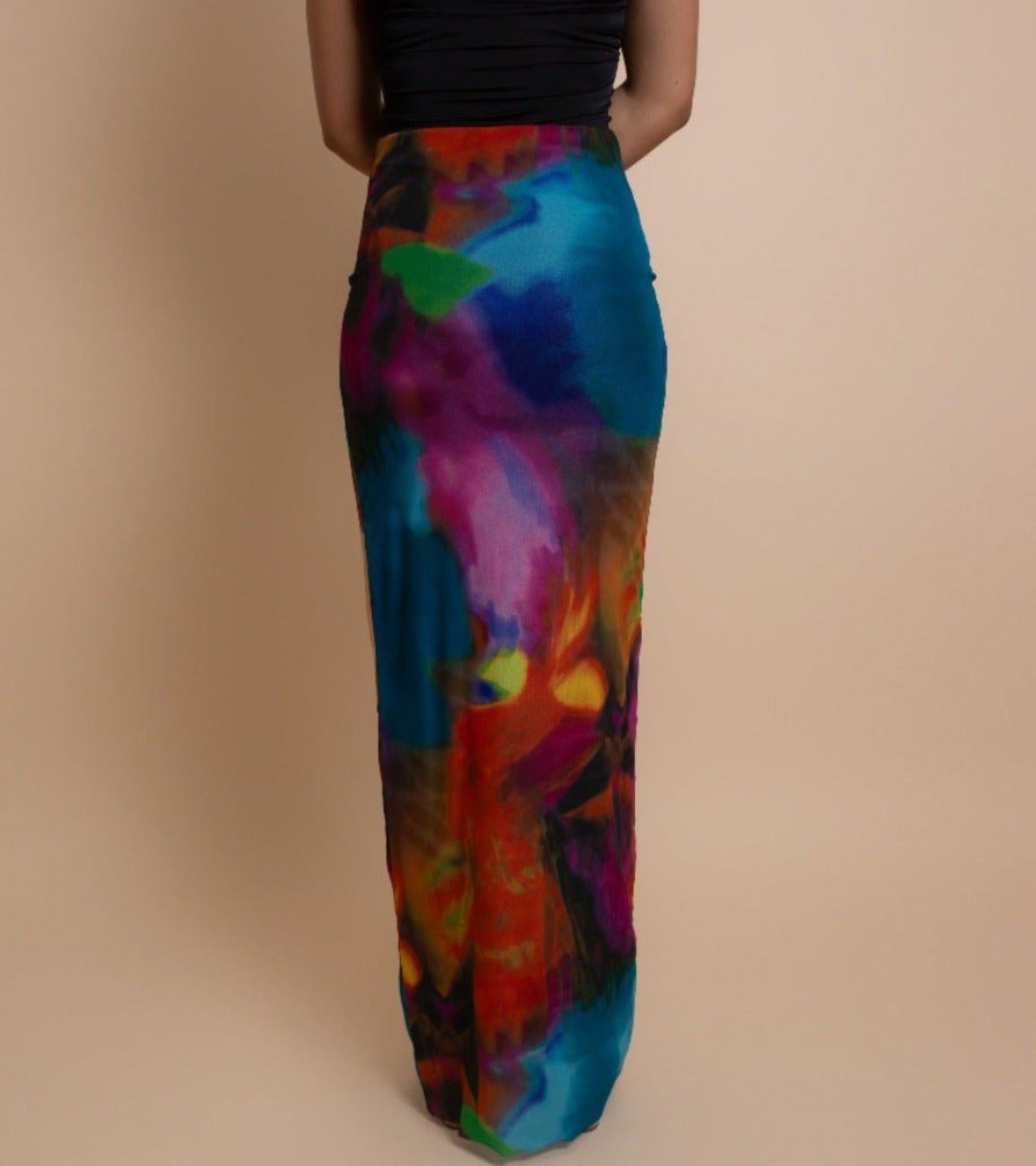 Spice up your wardrobe this season with our tie dye maxi length skirt! Featuring a contrast of colors double lined with an overlay of lace. Can be worn as a strapless dress or maxi skirt! Paired perfectly with a strappy sandal and a tote bag.